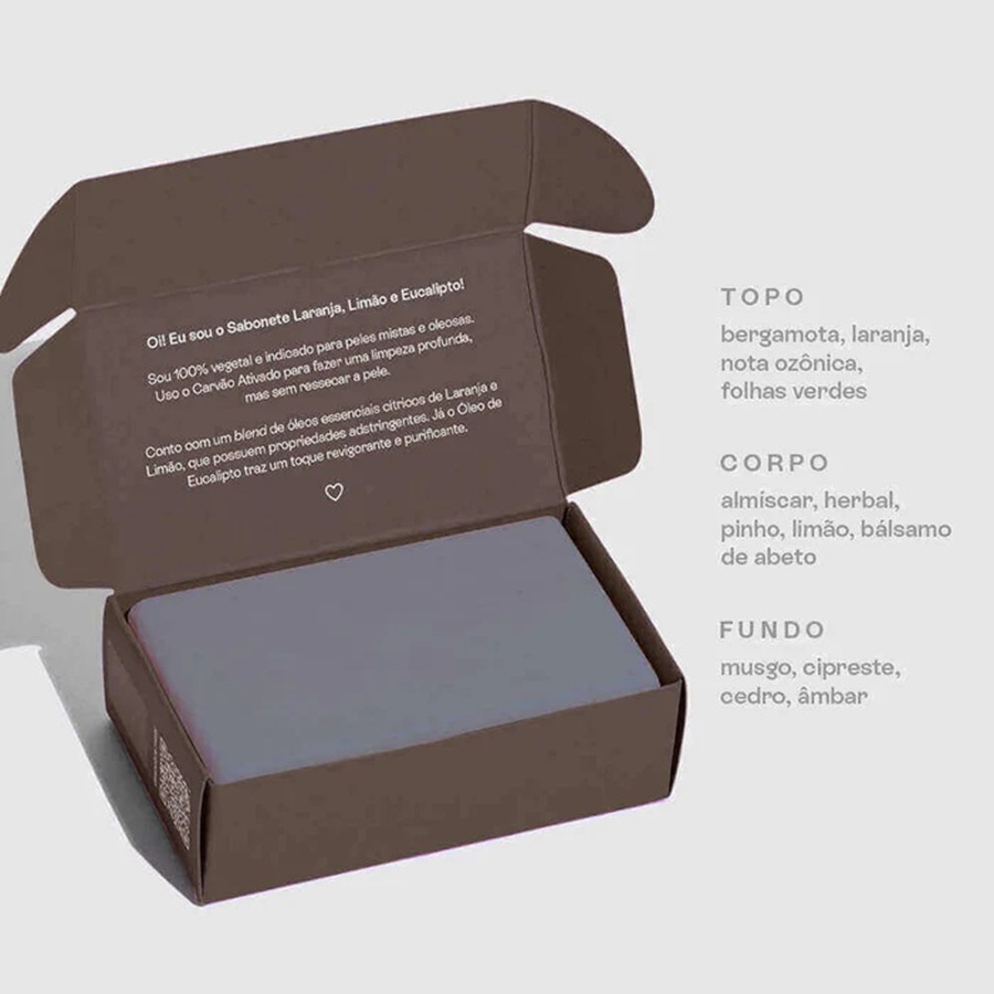 O Sabonete Natural de Laranja, Limão e Eucalipto foi desenvolvido para quem busca limpeza profunda, controle da oleosidade e sensação de frescor, sem agredir a pele. Sua base 100 por cento vegetal, combinada com carvão ativado e manteiga de karité, promove uma pele limpa, equilibrada e com aparência saudável desde o primeiro uso.